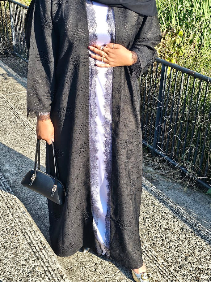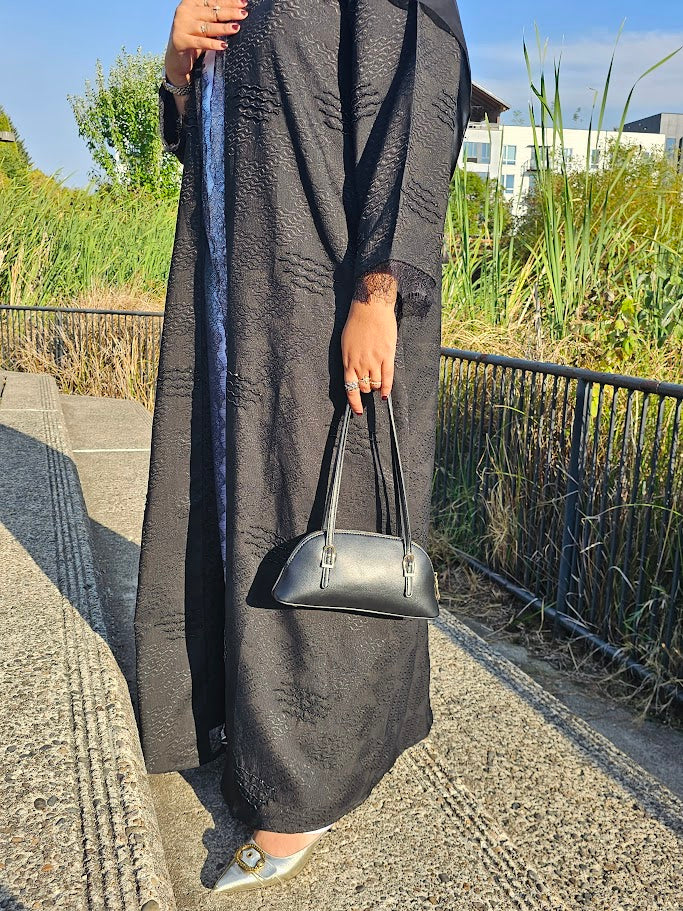 This abaya is a classic black overlay, with a subtle sheen, creating a luxurious yet versatile look. The design features delicate lace-like pattern along the front and sleeves, adding elegance without being overwhelming.
